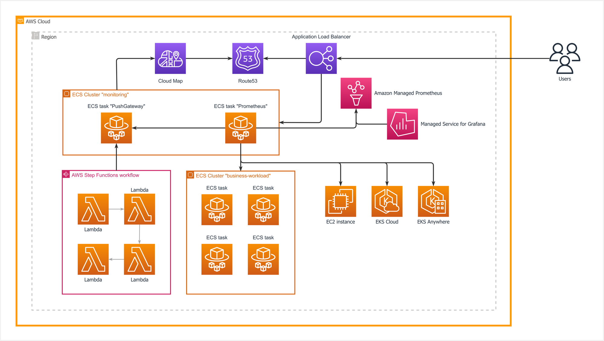- Since the standard Prometheus server (running on ECS) needs to scrape data from other ECS clusters or EC2 instances, AWS Cloud Map is utilized to define user-friendly names for easy and dynamic discovery.