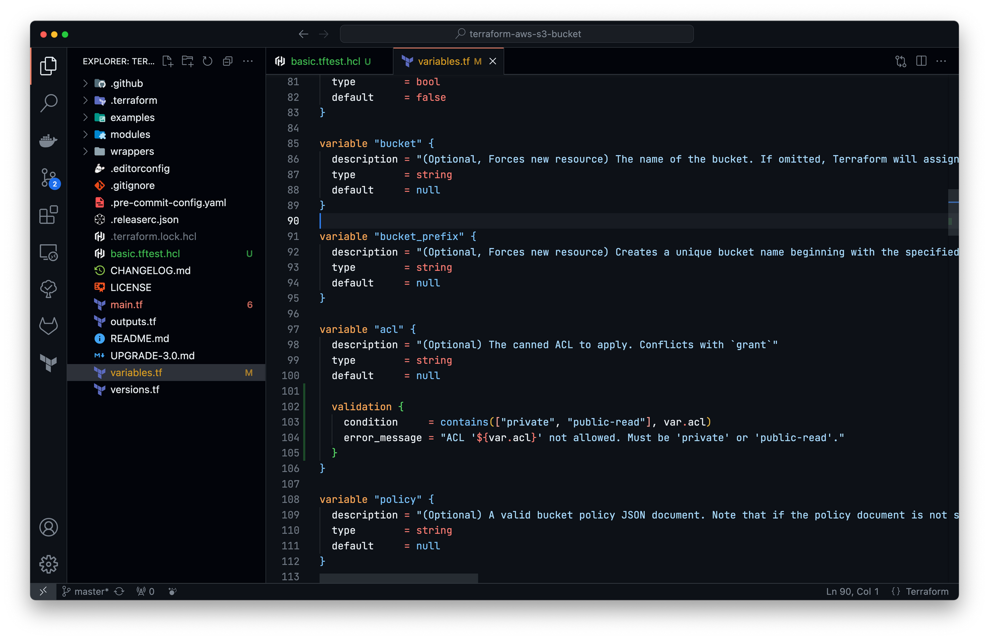 Back to our module, I want to support only two types of ACL rather that the full list: "private" and "public-read" (removing usage of "public-read-write", "authenticated-read", "aws-exec-read" and "log-delivery-write"). I will now modify the variable block "acl" to add this condition: